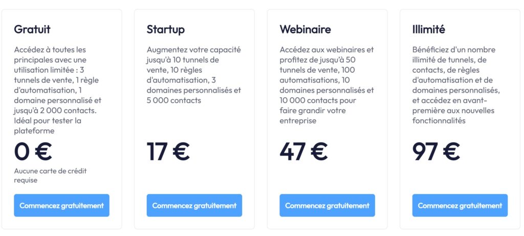 Le positionnement tarifaire de systeme.io est l’un de ses atouts majeurs. Il permet de démarrer avec un budget très maîtrisé et d’évoluer progressivement.